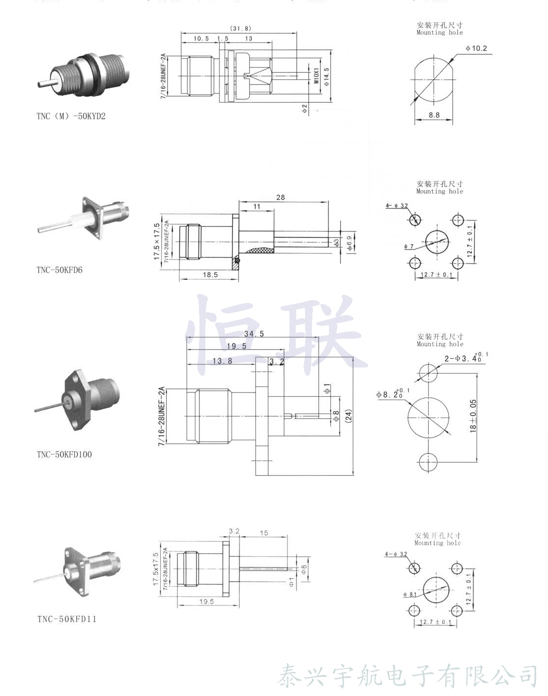 NC系列产品是按照美军标MIL-C-39012研制生产的一种有螺纹连接机构的中小功率连接器。它具有抗振性强、可靠性高、机械和电气性能优良等特点,广泛地应用于无线电设备和电子仪器中连接射频同轴电缆。该系列产品能与国际上TNC系列射频同轴连接器相应产品进行互换。