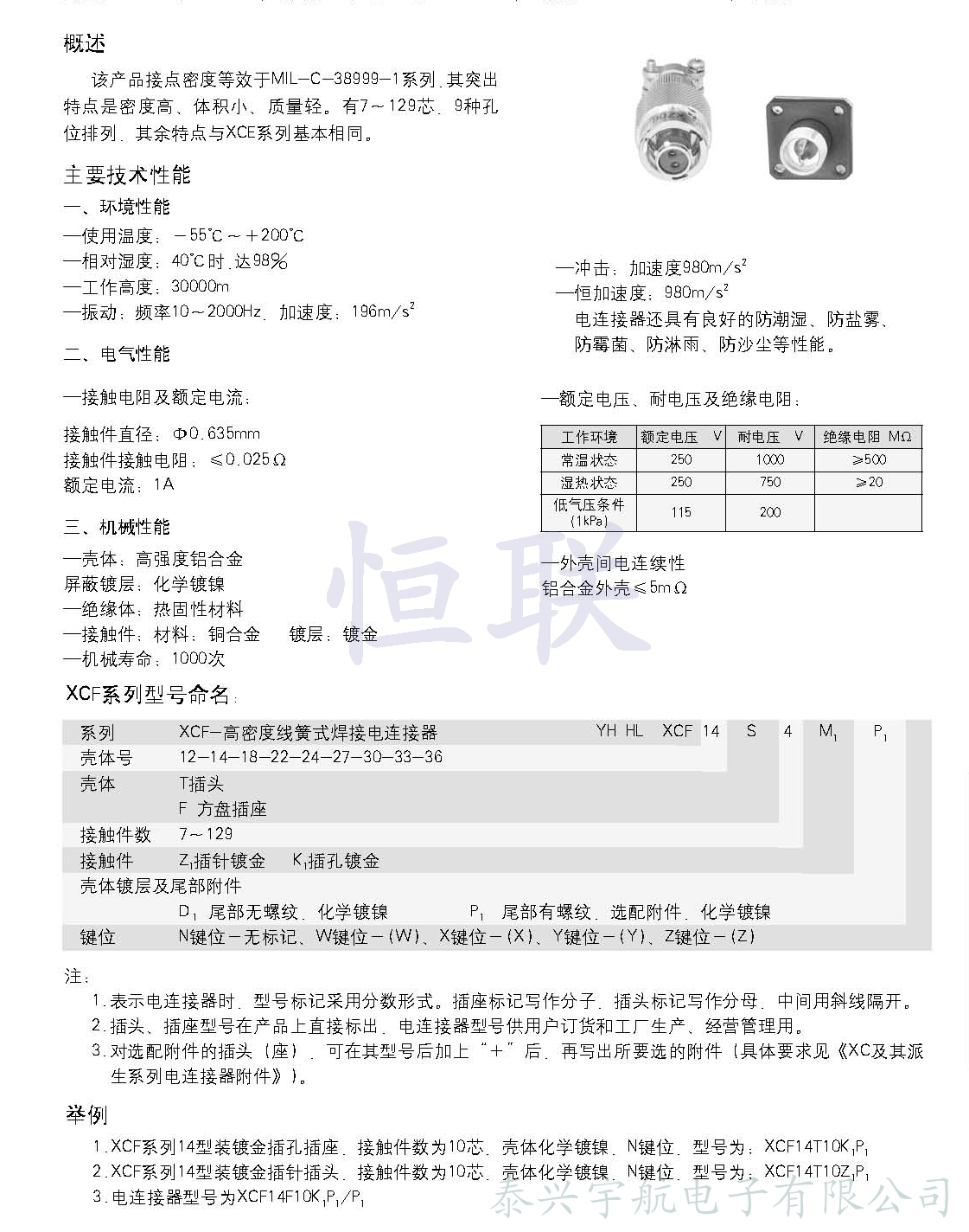该产品等效于MIL-C-38999 I,突出特点即为密度高,体积小,重量轻,7~129芯,9种孔位排列,其余特点与XCE系列基本相同。等效于XCF系列且同一型号对应插头座可以互配。
