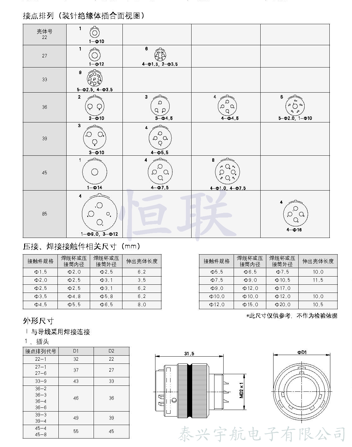 该系列产品专供电源使用,卡口式快速连接,插座有方形法兰式安装和螺母并紧安装两种方式。双曲面线簧式插孔,五种识别键位,插头,插座均可装针,亦可装孔,与导线端接采用焊接方式,广泛应用于大电流条件下的电连接。